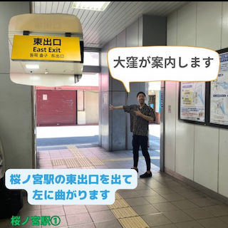 ①東出口の改札を出て左、外に出たら道を左方向に進みます
