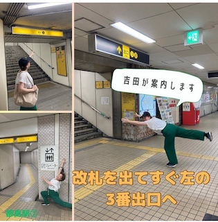 ①改札を出てすぐ左手の3号出口から、階段かエレベーターで地上へ