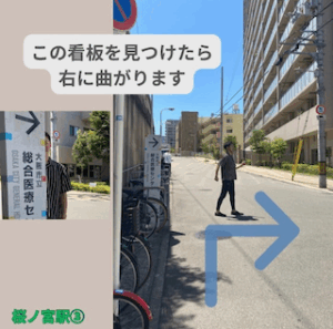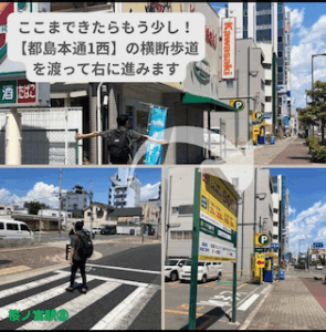 ⑥郵便局の前を通り過ぎて、大通りに出たら右方向へ進みます