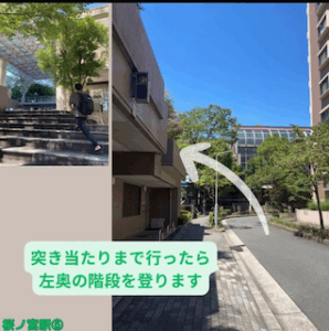 ⑤突き当りに見えてくる階段を上って、大きな屋根の下に入ります
