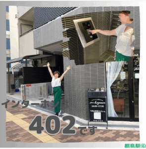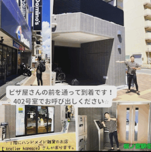 ⑧ピザ屋さんの前を通り過ぎて、1階にハンドメイド雑貨屋さんが入っている角のマンションです